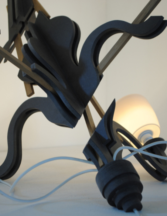 Déstructure, lustre à poser. MDF noir, chêne